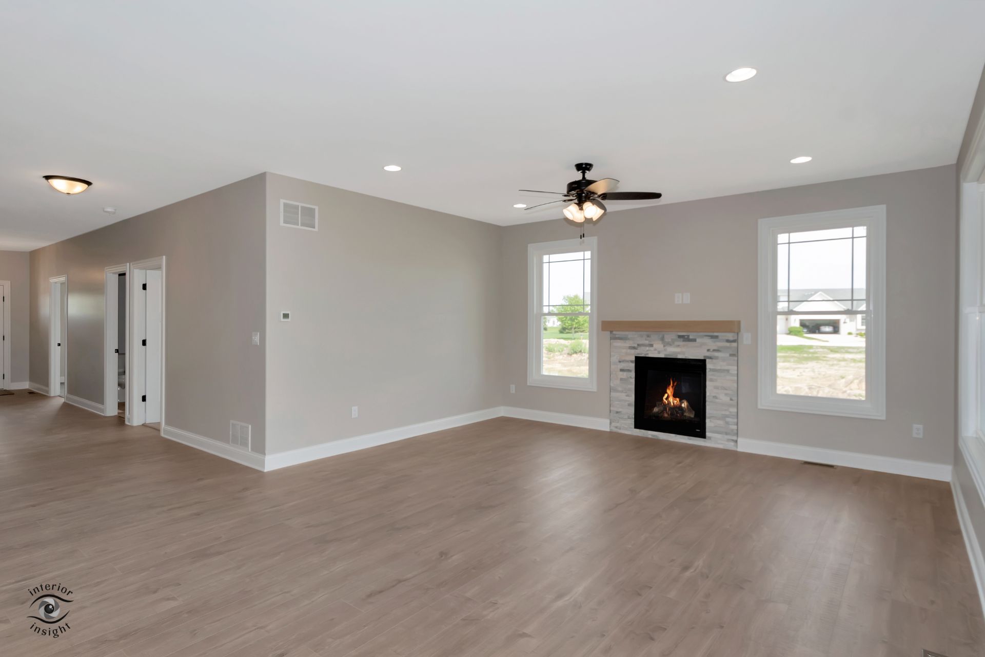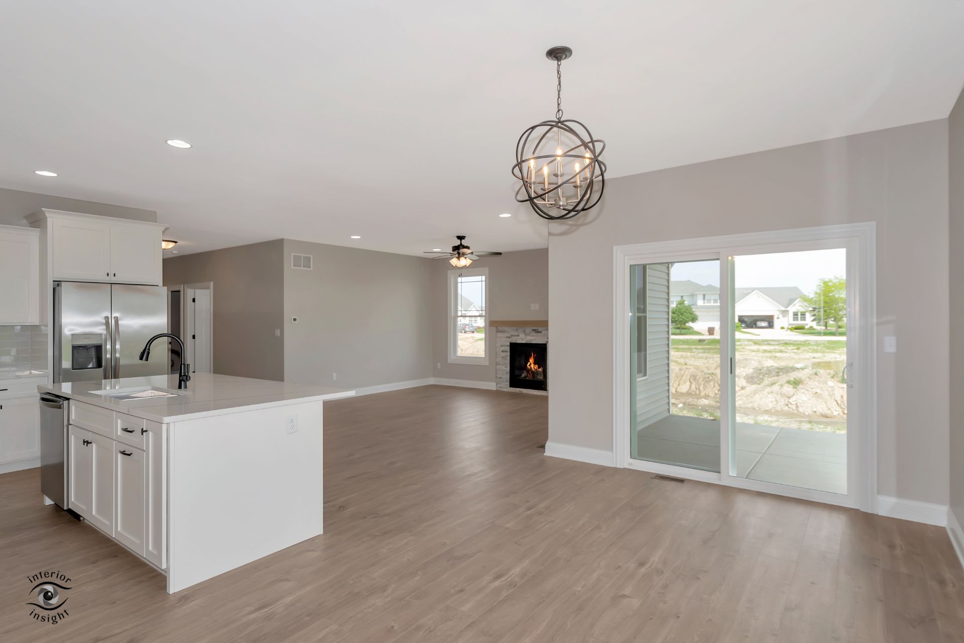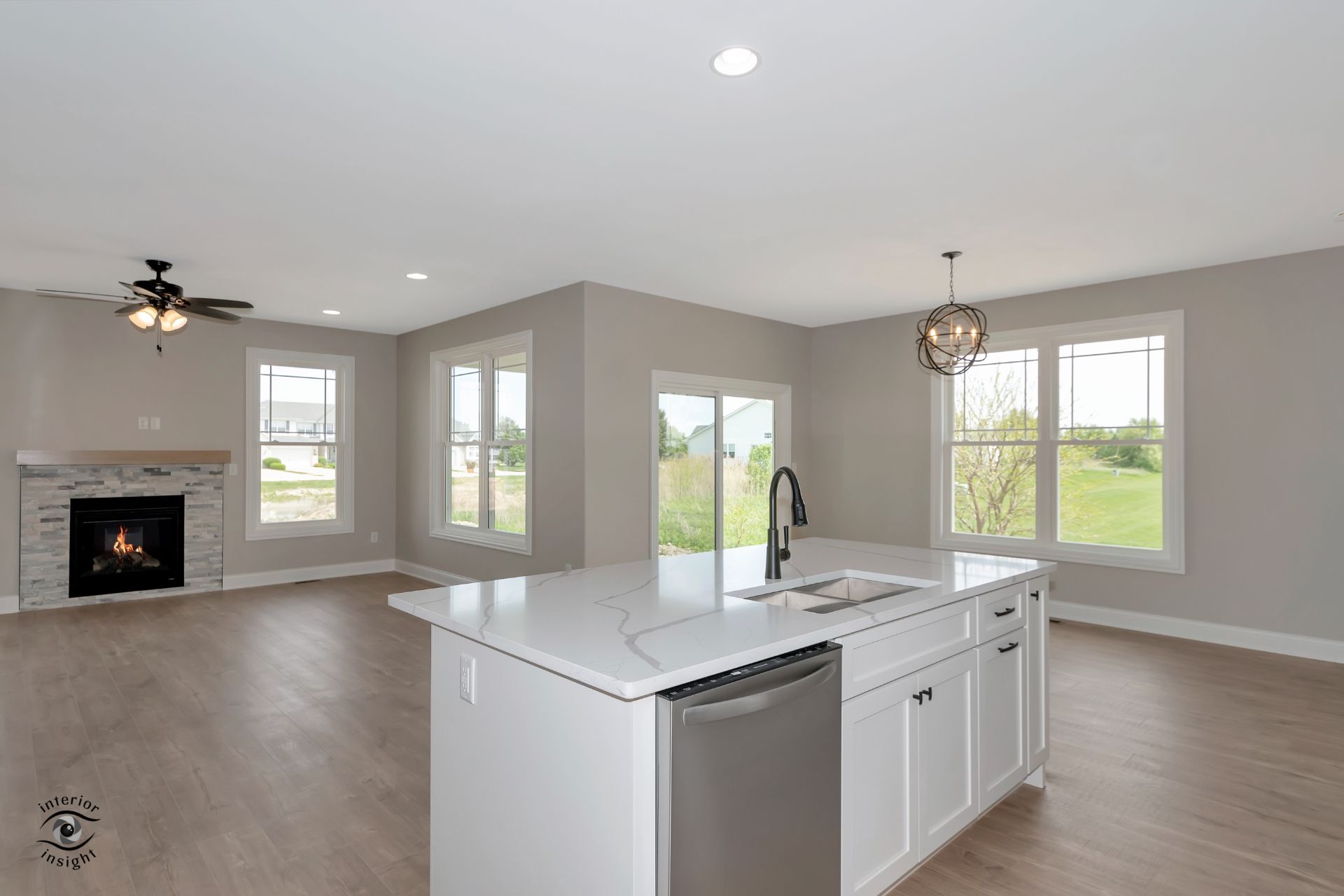 • Open-concept great room w/fire place and boot bench.