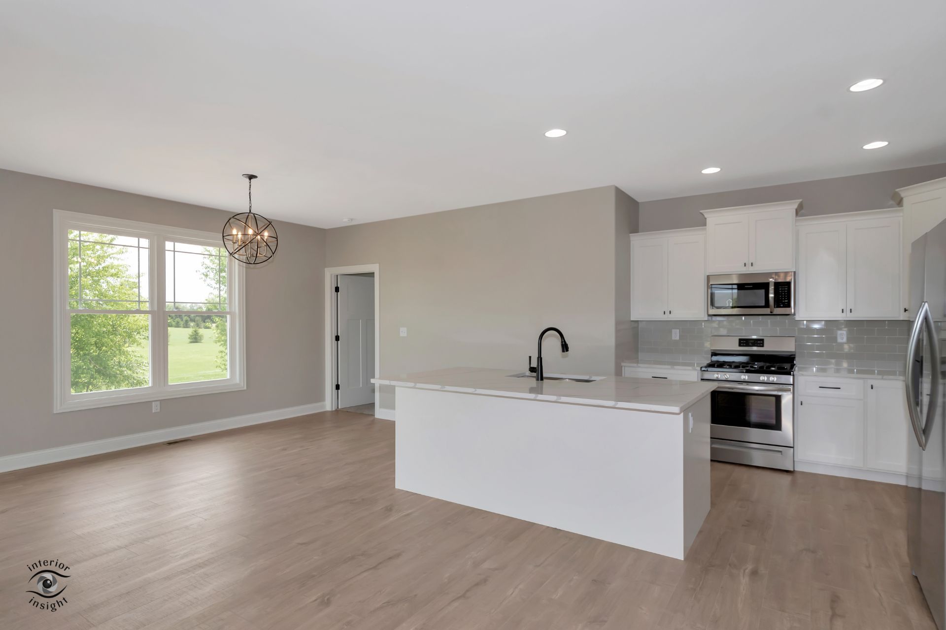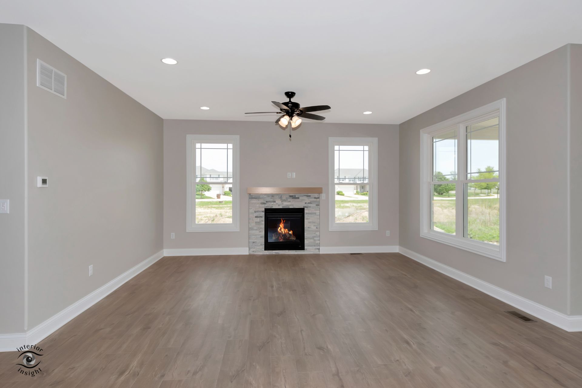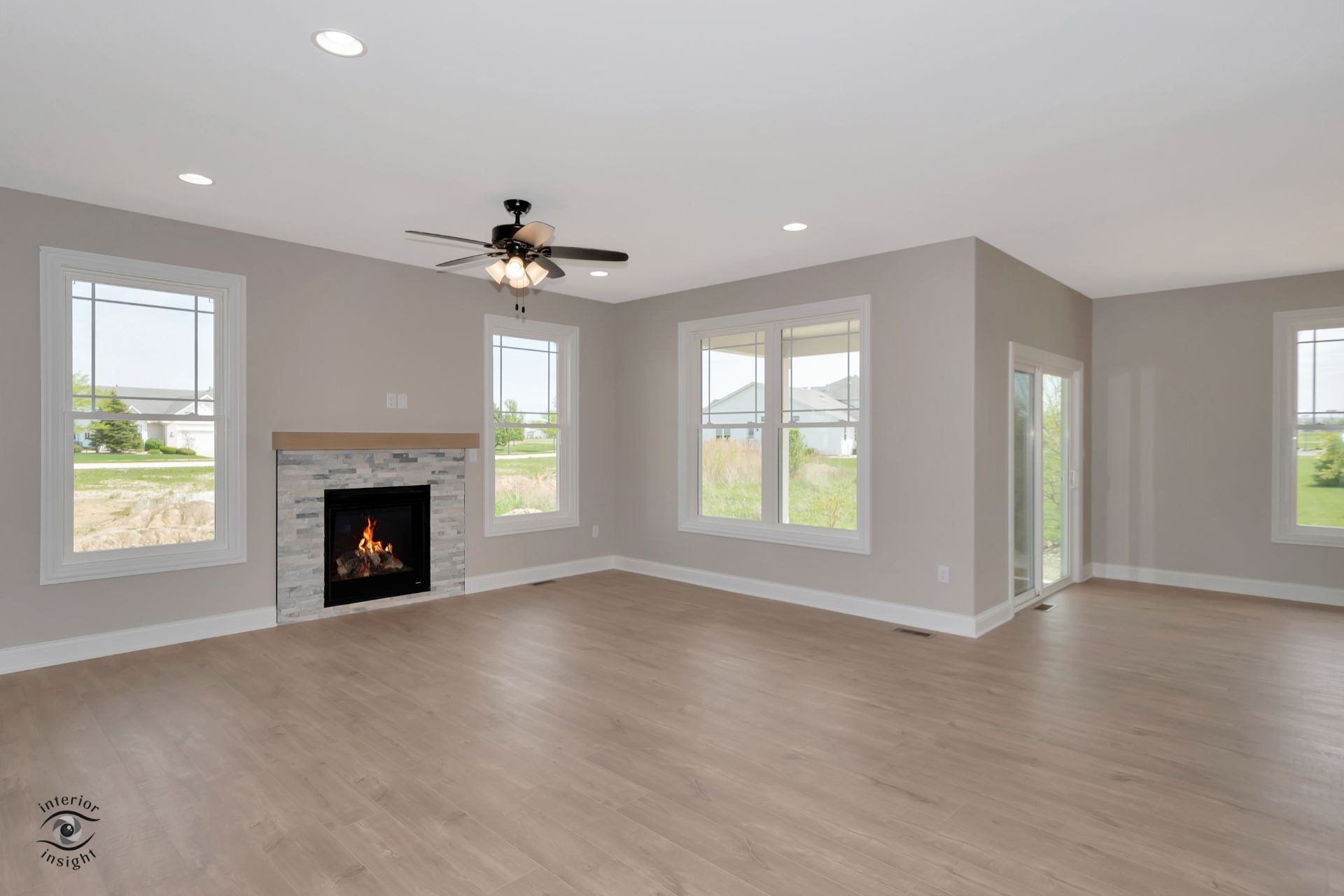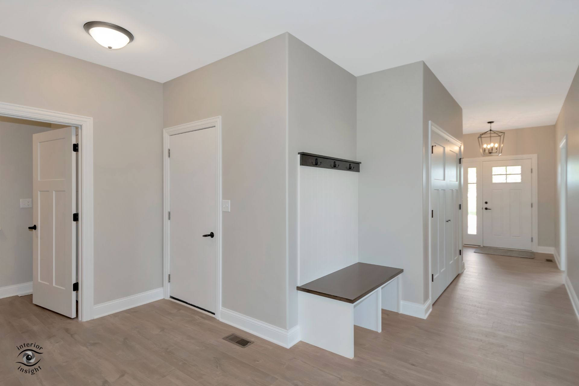 • Open-concept great room w/fire place and boot bench.