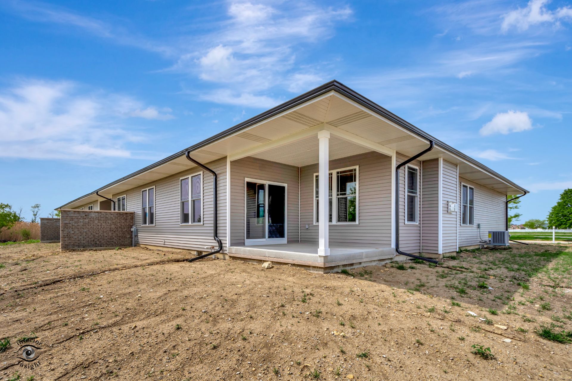• Private patio overlooking yard w/partial brick divider.
